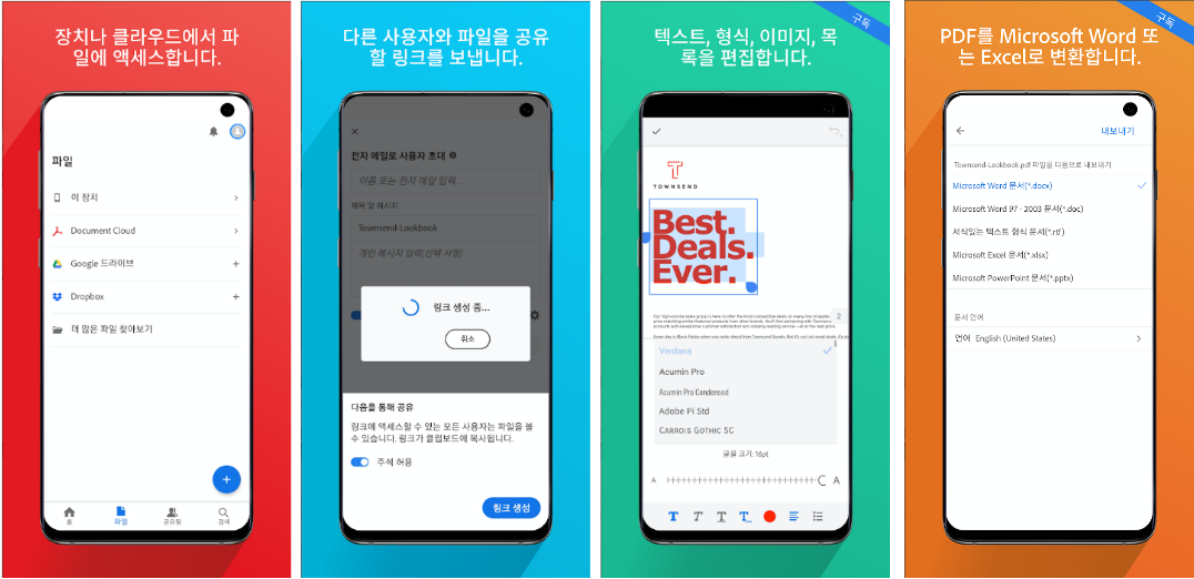 • Acrobat Reader에서 직접 Google 드라이브 파일을 생성, 보기, 편집, 결합, 압축, 내보내기, 공유 및 별표 표시할 수 있습니다.