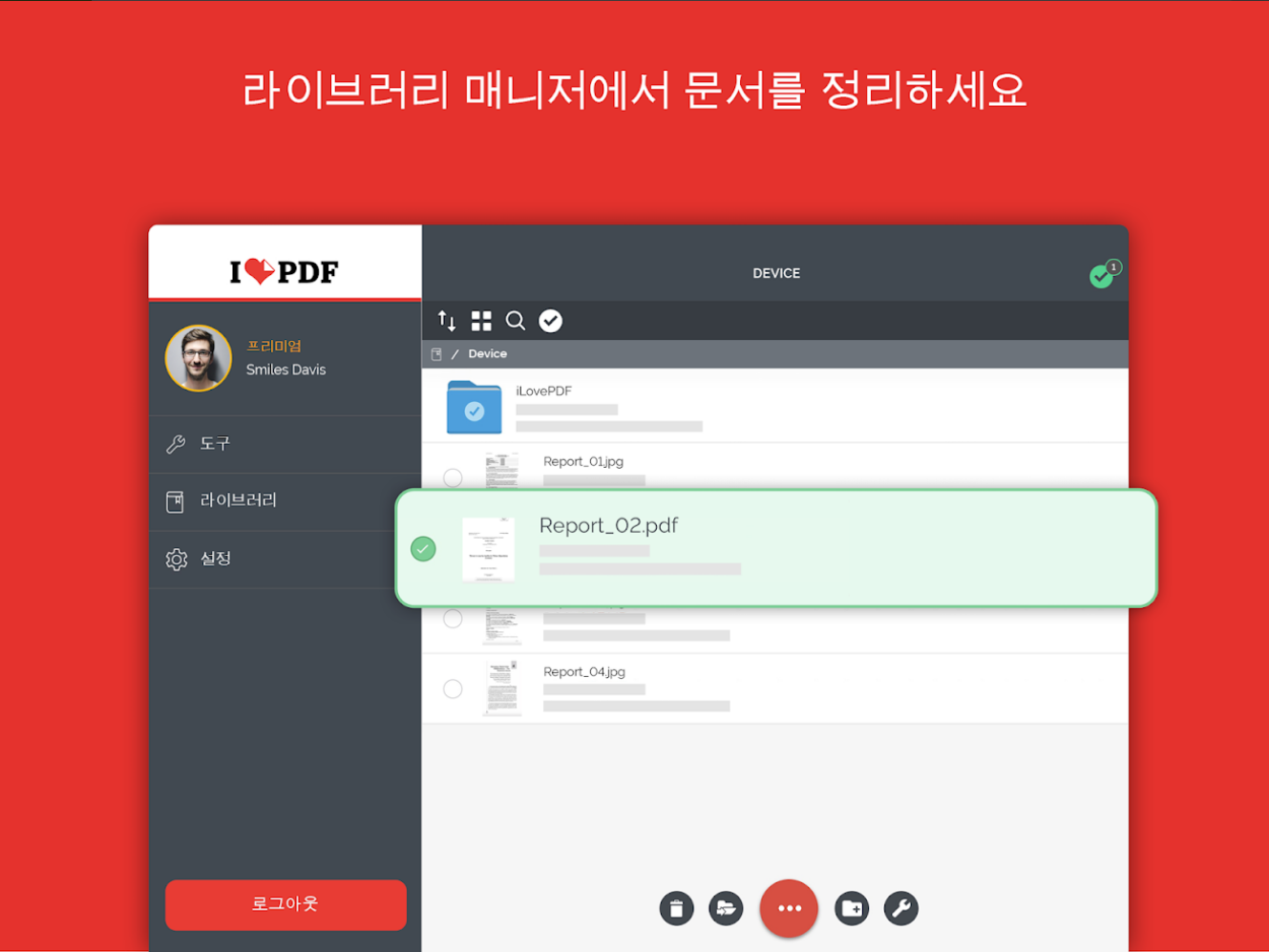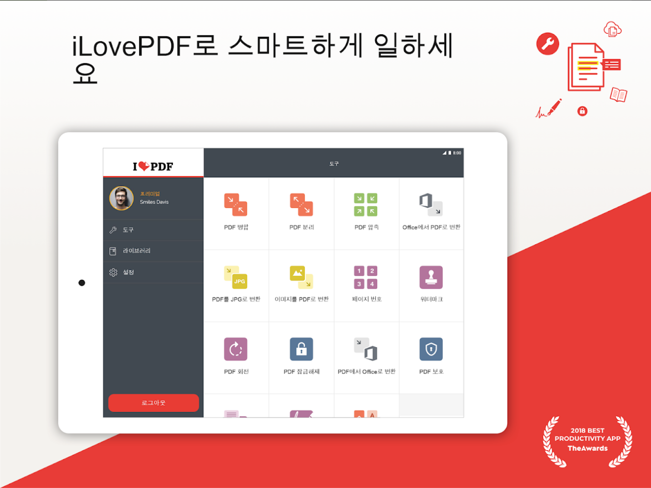 모든 PDF 도구를 한곳에 모았습니다! PDF 파일 편집과 수정을 100% 무료로 간편하게 할 수 있습니다! PDF 문서에 서명을 추가하거나 기기에서 바로PDF 양식을 작성 할 수 있습니다. iLovePDF 모바일 앱은 무료 PDF 리더/뷰어와 PDF 에디터의 완벽한 조합으로 매일 수백만 사용자의 시간을 절약해 줍니다. 스마트폰 또는 태블릿을 이용해 이동 중에도 편리하게 문서 편집이 가능해 효율적이고 빠른 작업이 가능합니다.